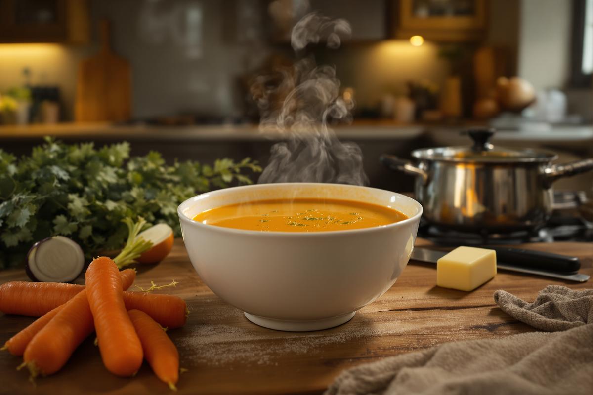 On a tous connu ce moment un peu décourageant : rentrer tard, ouvrir le frigo et trouver… pas grand-chose. Juste quelques carottes, un oignon au fond du panier à légumes, un peu de beurre. Pas de crème. Pas de bouillon. Pourtant c’est suffisant.
